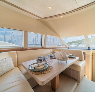 Fully air-conditioned interior with cozy dinette, kitchen area, and spacious salon. Three refrigerators, an ice maker, Wi-Fi, snorkeling gear, and optional paddleboard and Seabob are available. Relax on the sun deck or enjoy family meals in the shaded lounge.