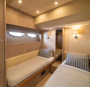 The yacht features 1 master cabin, 1 VIP cabin, and 1 convertible twin cabin, all with ensuite facilities. The convertible twin includes a double bed that extends wall-to-wall upon request. Additional crew accommodation includes a separate captain’s compartment and hostess space in the main cabin area.