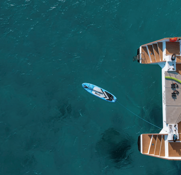 Supernova is a unique 57ft high-end catamaran designed for luxury day tours in Mykonos. With a spacious 35m² loft-style deck, jumping platform at the stern, and oversized forward nets, this vessel offers premium comfort and a lively layout perfect for group cruising. Its design encourages social lounging, water play, and carefree enjoyment throughout the journey.